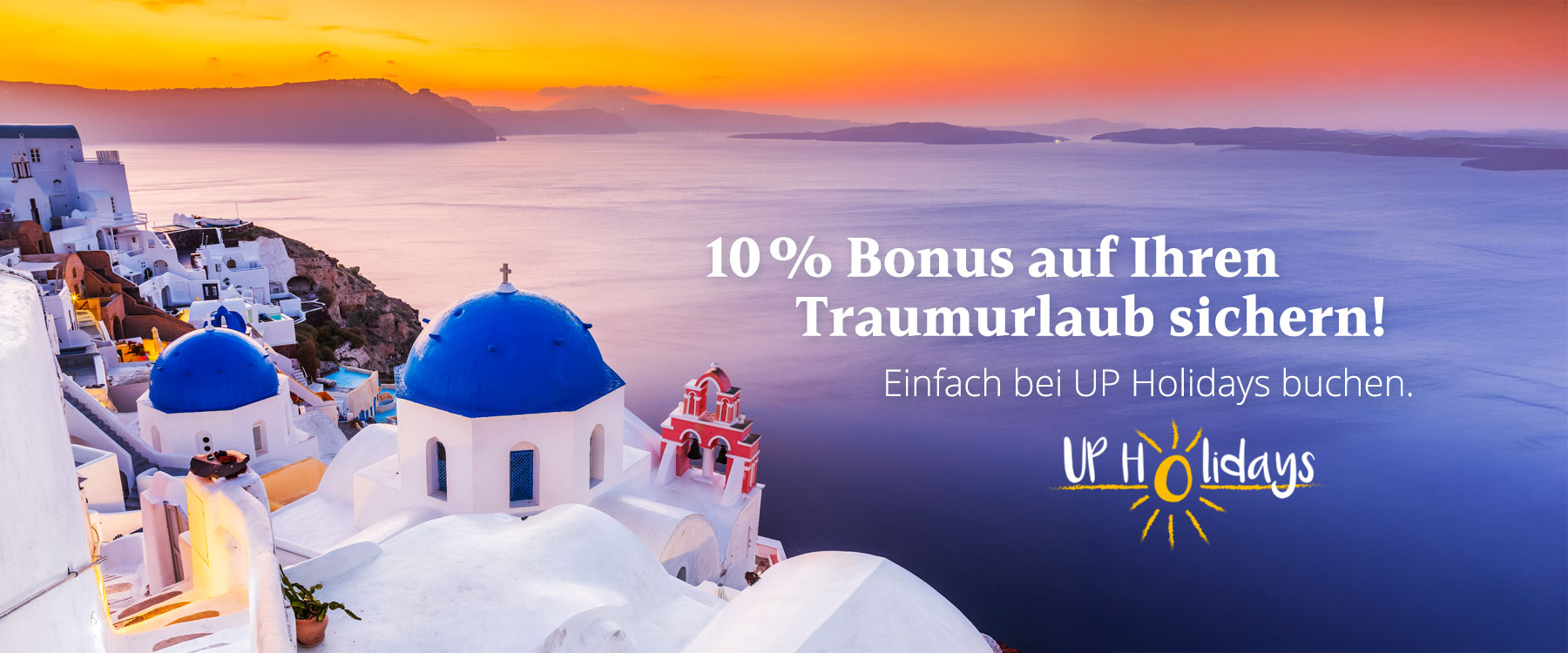 Sonnenuntergang über Santorini mit den ikonischen weißen Häusern und blauen Kuppelkirchen, bewirbt 7% Bonus auf Reisen bei UP Holidays.