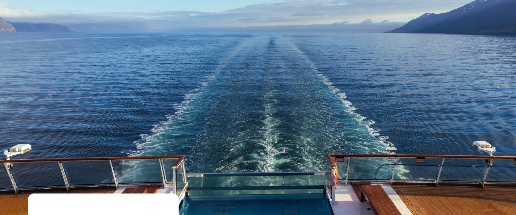 Blick über die Reling eines Kreuzfahrtschiffs auf das offene Meer. Die Kielspur des Schiffs zieht sich in die weite, blaue Ferne.