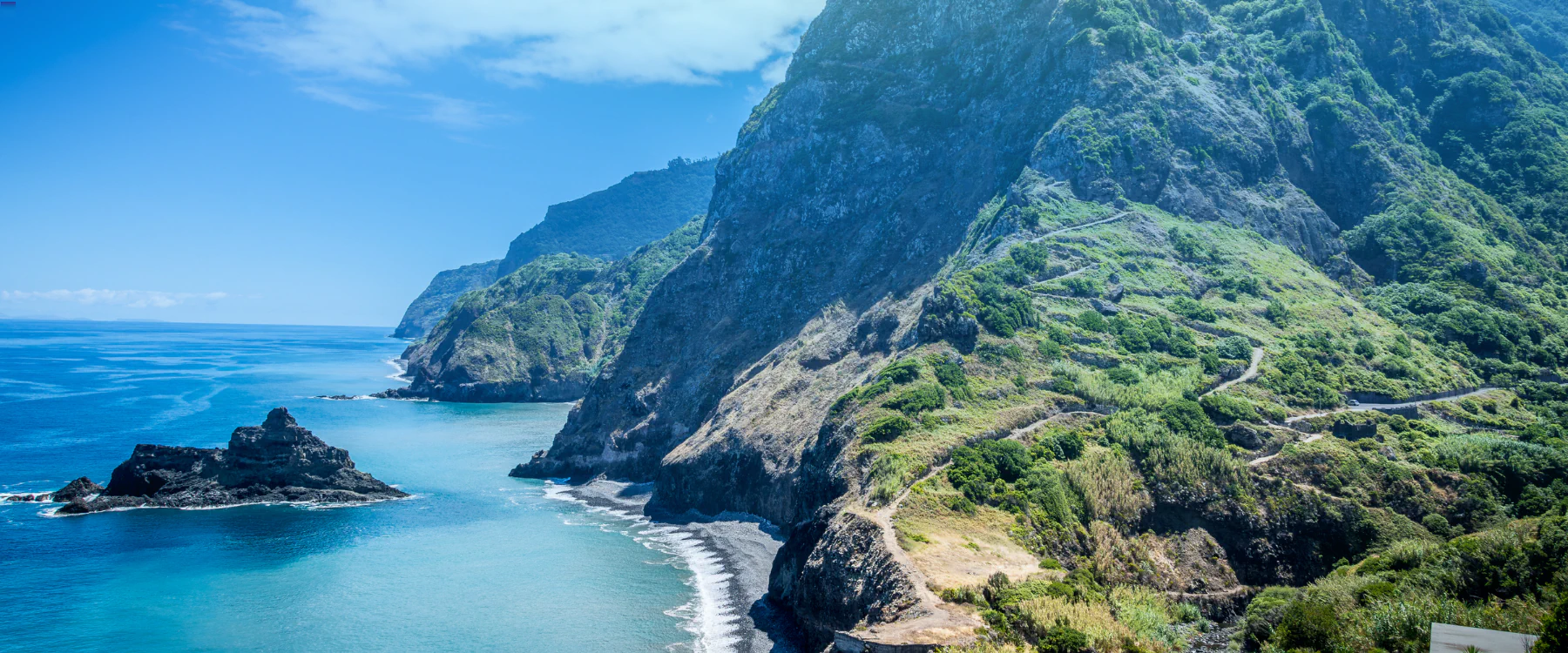 Dunkle Felsküste und schwarzer Kiesstrand auf den Kanarischen Inseln. Ein Boot zieht eine weiße Spur durch das tiefblaue Meer.