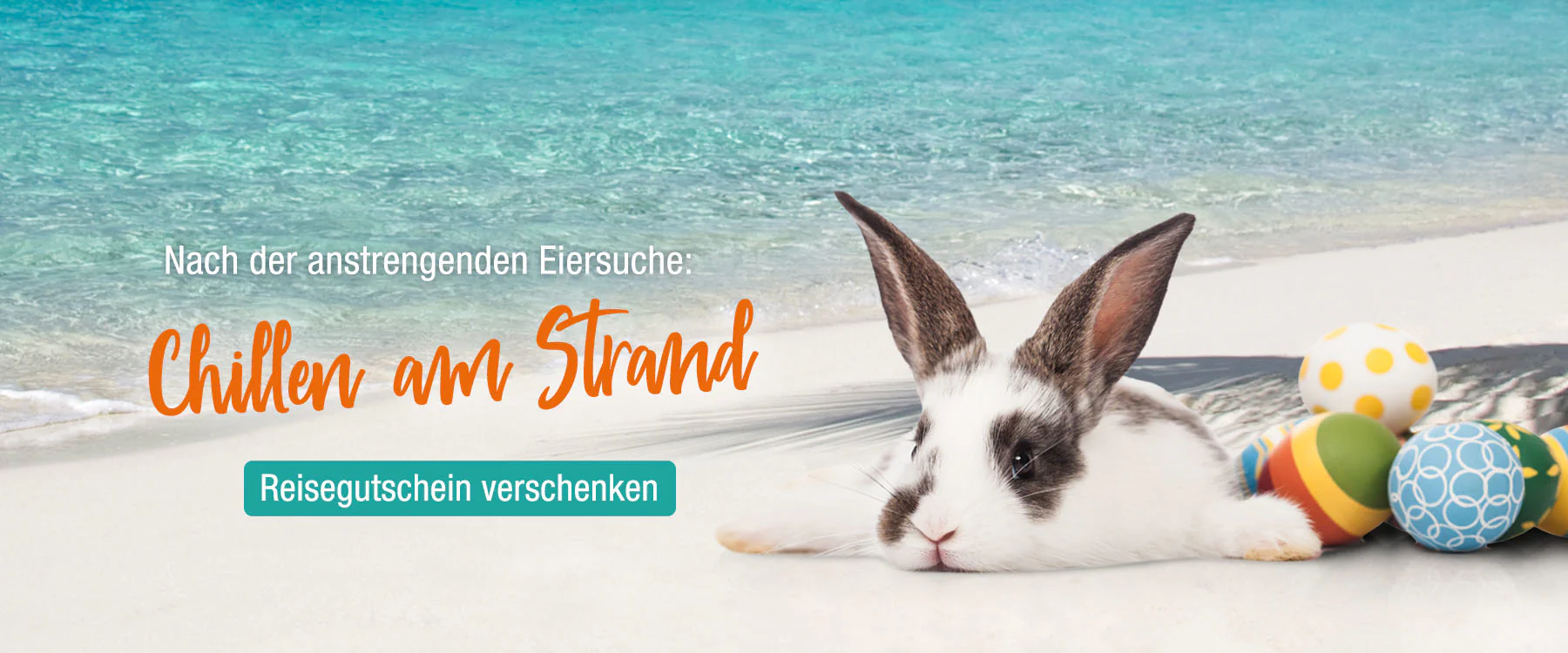Hase am Strand mit Ostereiern und Text Chillen am Strand sowie Button Reisegutschein verschenken